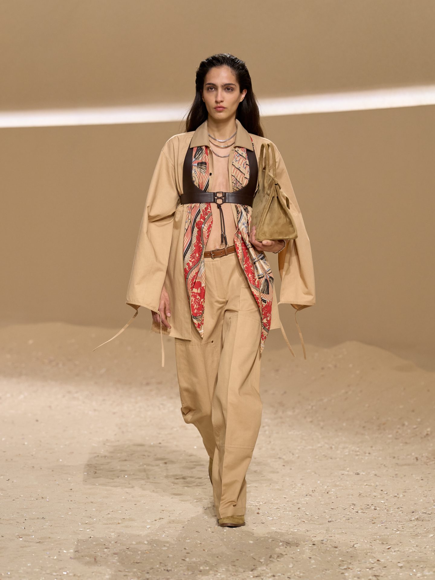 Gonne longuette dal taglio asimmetrico, trench e capospalla dalla lavorazione matelassé, mini gilet e top con cinghie sfilano alla Paris Fashion Week sulla passerella Primavera/Estate 2026 di Hermes