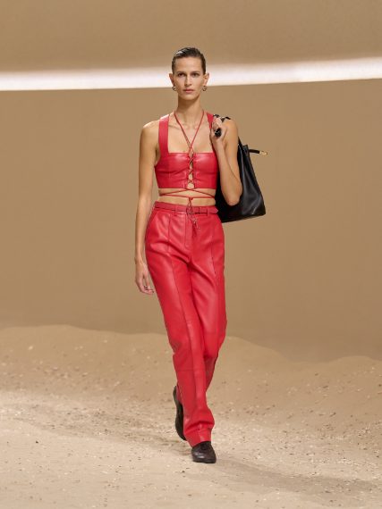 Gonne longuette dal taglio asimmetrico, trench e capospalla dalla lavorazione matelassé, mini gilet e top con cinghie sfilano alla Paris Fashion Week sulla passerella Primavera/Estate 2026 di Hermes