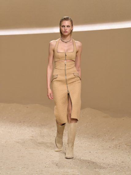 Gonne longuette dal taglio asimmetrico, trench e capospalla dalla lavorazione matelassé, mini gilet e top con cinghie sfilano alla Paris Fashion Week sulla passerella Primavera/Estate 2026 di Hermes