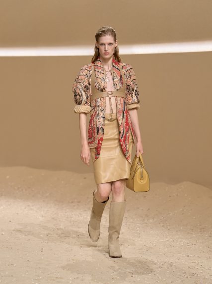 Gonne longuette dal taglio asimmetrico, trench e capospalla dalla lavorazione matelassé, mini gilet e top con cinghie sfilano alla Paris Fashion Week sulla passerella Primavera/Estate 2026 di Hermes
