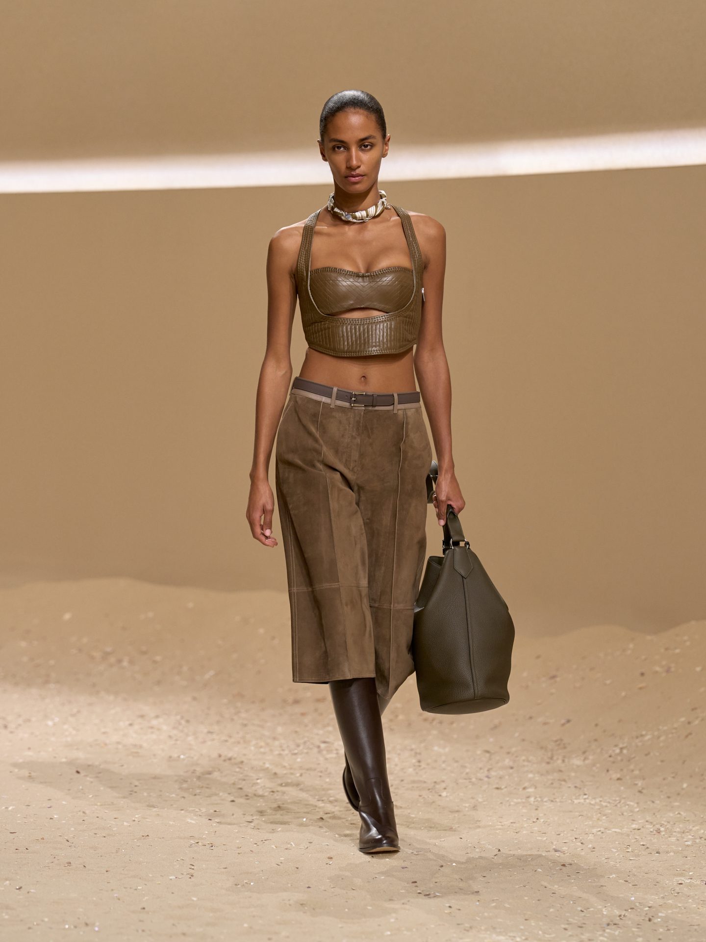 Gonne longuette dal taglio asimmetrico, trench e capospalla dalla lavorazione matelassé, mini gilet e top con cinghie sfilano alla Paris Fashion Week sulla passerella Primavera/Estate 2026 di Hermes