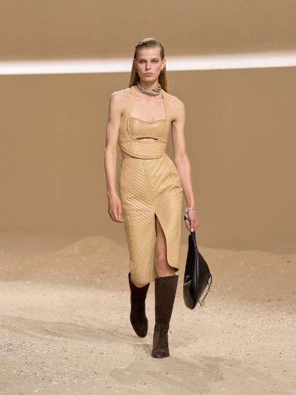 Gonne longuette dal taglio asimmetrico, trench e capospalla dalla lavorazione matelassé, mini gilet e top con cinghie sfilano alla Paris Fashion Week sulla passerella Primavera/Estate 2026 di Hermes