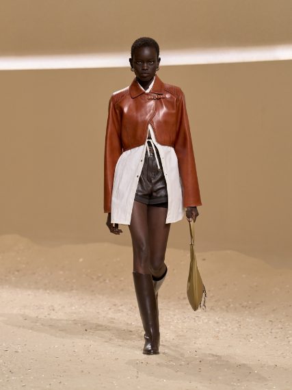 Gonne longuette dal taglio asimmetrico, trench e capospalla dalla lavorazione matelassé, mini gilet e top con cinghie sfilano alla Paris Fashion Week sulla passerella Primavera/Estate 2026 di Hermes
