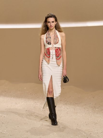 Gonne longuette dal taglio asimmetrico, trench e capospalla dalla lavorazione matelassé, mini gilet e top con cinghie sfilano alla Paris Fashion Week sulla passerella Primavera/Estate 2026 di Hermes