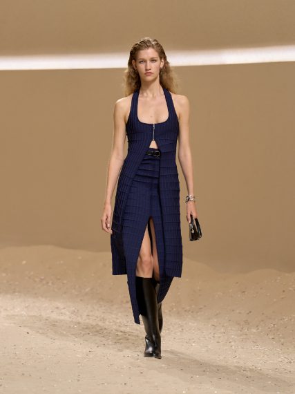 Gonne longuette dal taglio asimmetrico, trench e capospalla dalla lavorazione matelassé, mini gilet e top con cinghie sfilano alla Paris Fashion Week sulla passerella Primavera/Estate 2026 di Hermes