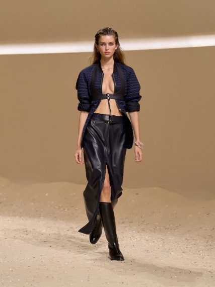 Gonne longuette dal taglio asimmetrico, trench e capospalla dalla lavorazione matelassé, mini gilet e top con cinghie sfilano alla Paris Fashion Week sulla passerella Primavera/Estate 2026 di Hermes