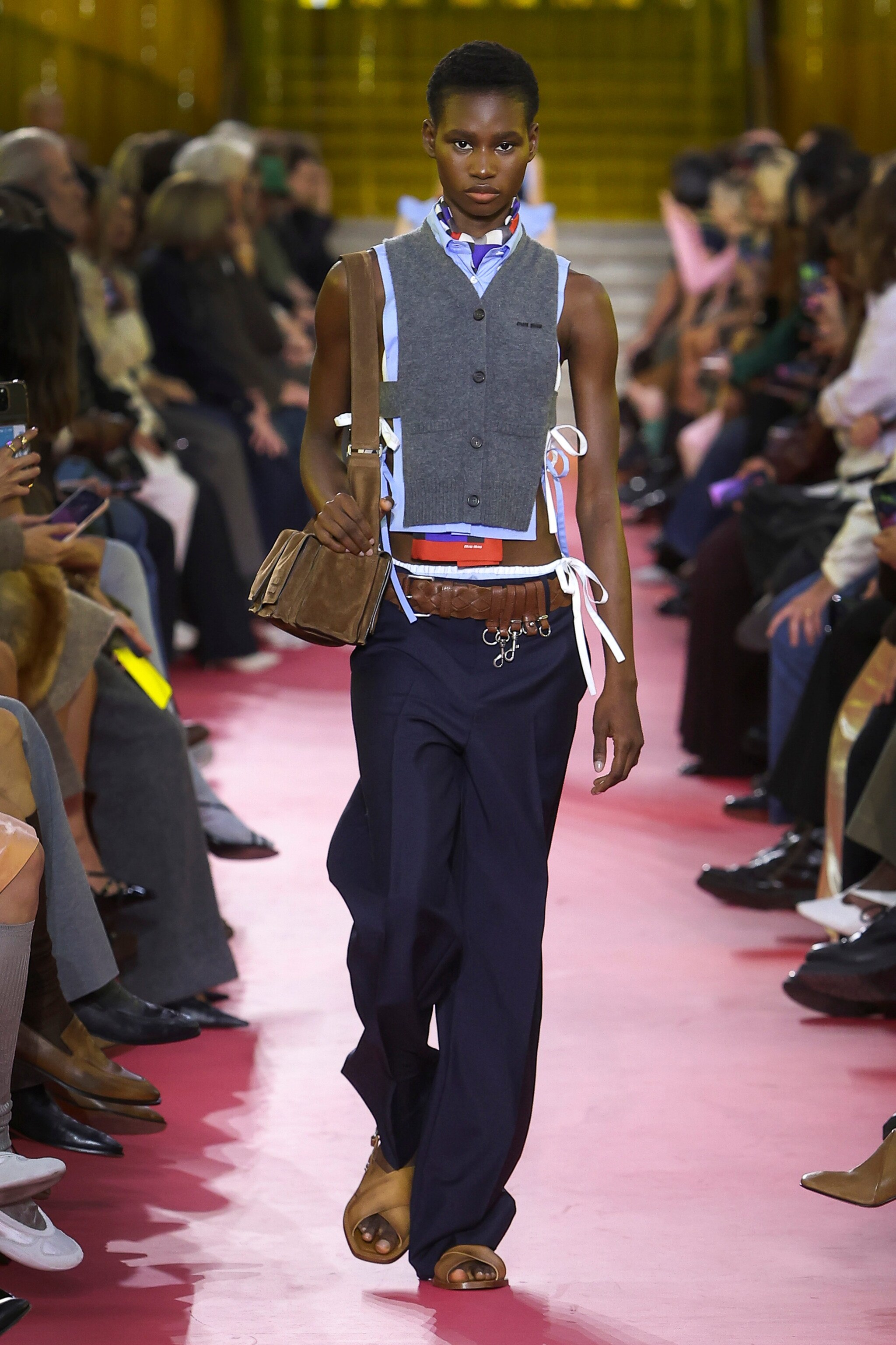 Miu Miu sfila alla Paris Fashion Week, sulla passerella Primavera/Estate 2025 Miuccia Prada sceglie il grembiule come simbolo per celebrare il lavoro in ogni forma, trasformando il capo aggiungendo pizzi, ruche e altri decori.