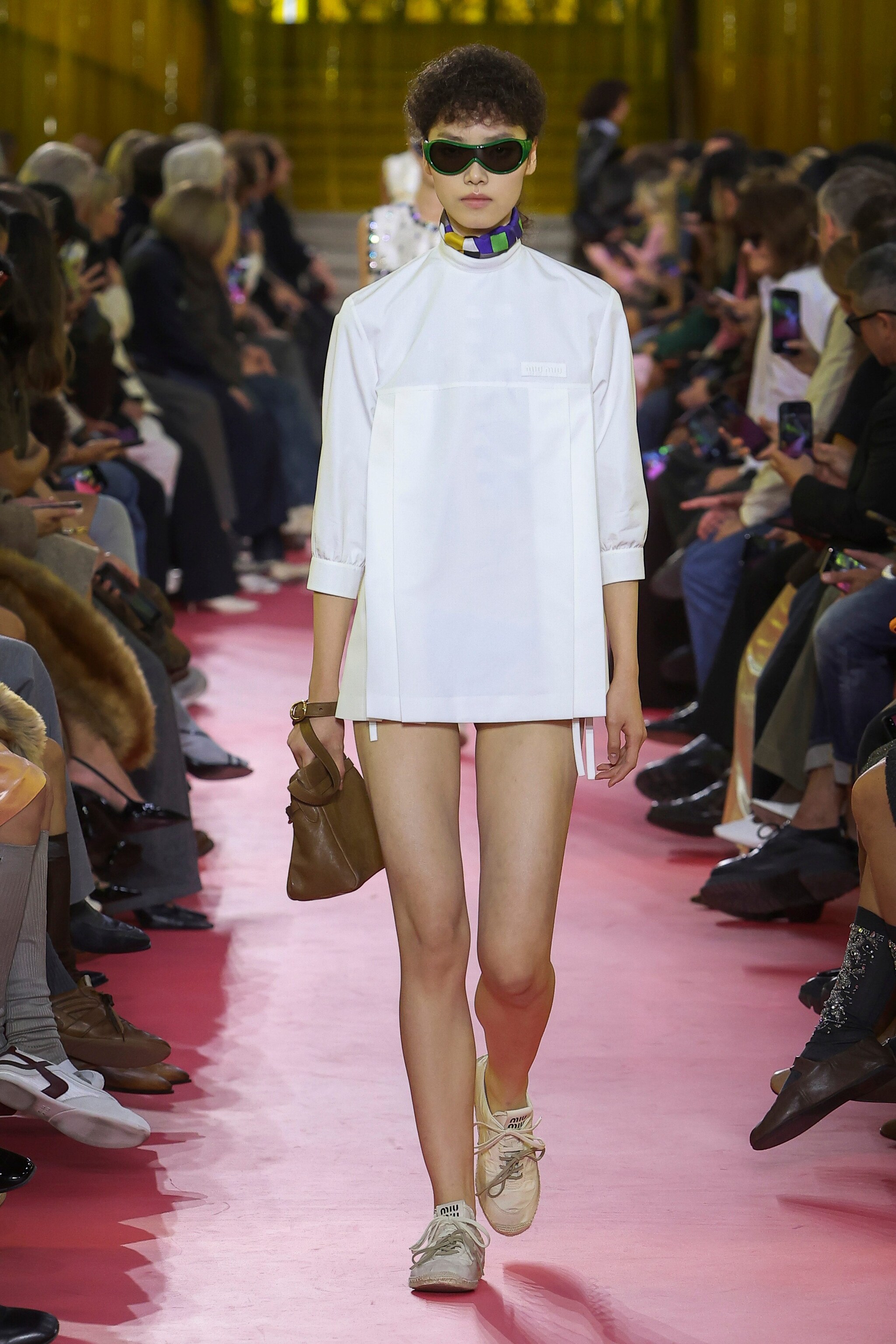 Miu Miu sfila alla Paris Fashion Week, sulla passerella Primavera/Estate 2025 Miuccia Prada sceglie il grembiule come simbolo per celebrare il lavoro in ogni forma, trasformando il capo aggiungendo pizzi, ruche e altri decori.