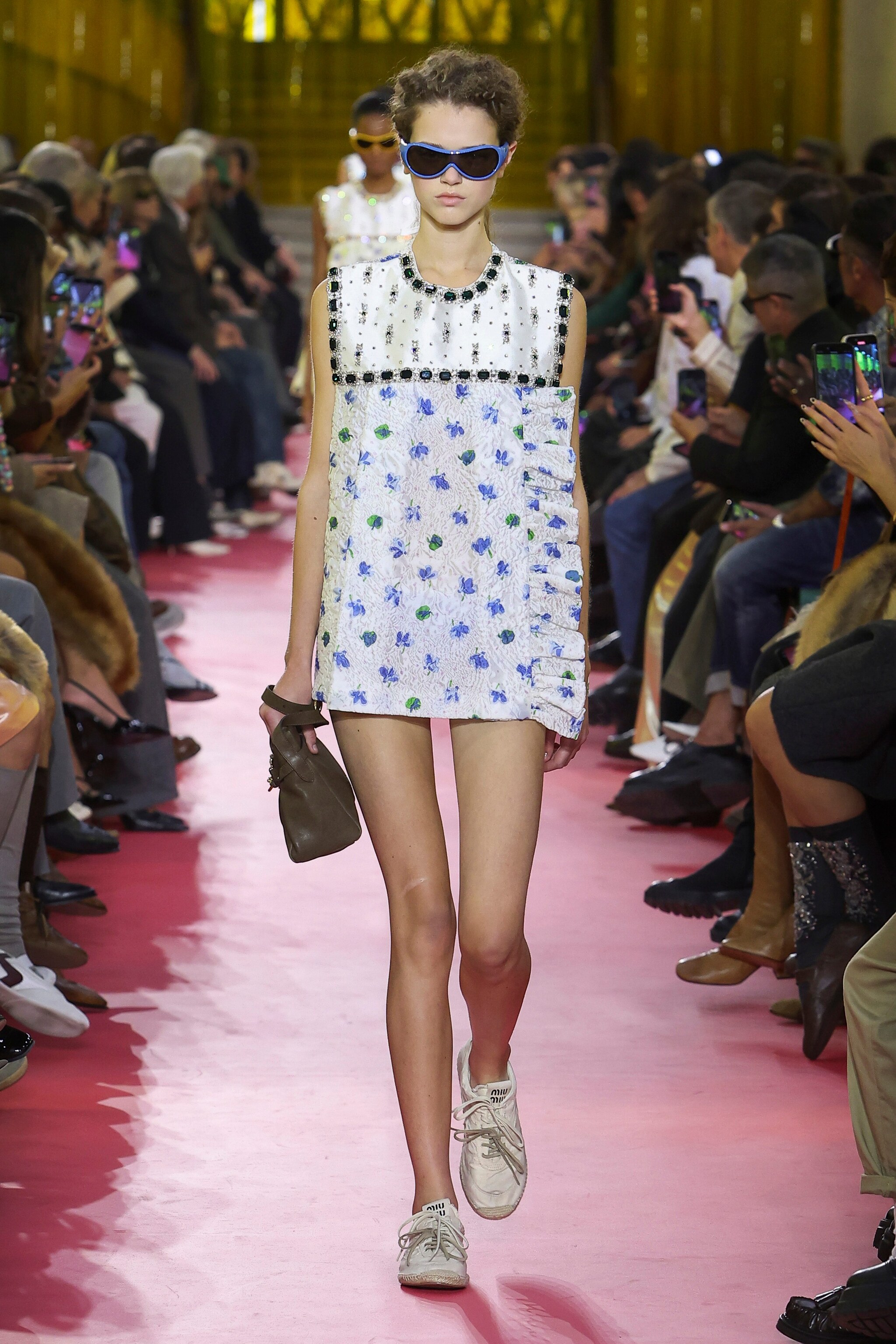 Miu Miu sfila alla Paris Fashion Week, sulla passerella Primavera/Estate 2025 Miuccia Prada sceglie il grembiule come simbolo per celebrare il lavoro in ogni forma, trasformando il capo aggiungendo pizzi, ruche e altri decori.