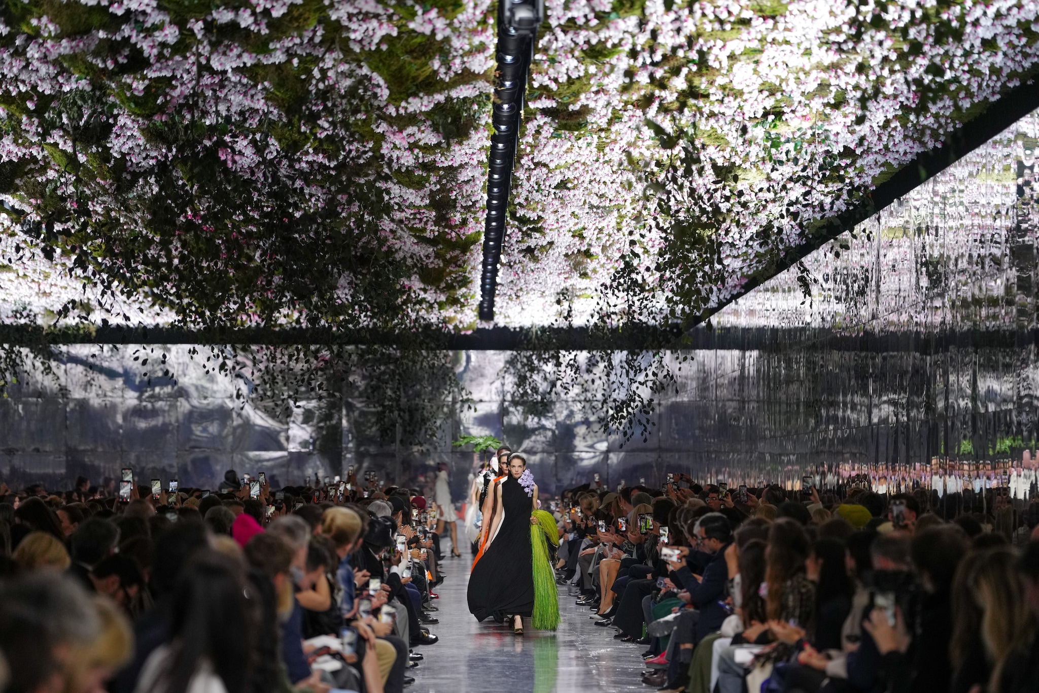 Volumi estremi, architettonici abiti dalle line tondeggianti, gonne balloon e abiti coperti di fiori tridimensionali sfilano alla Settimana dell'Alta Moda di Parigi sulla passerella Primavera/Estate 2026 di Dior nella collezione creata da Jonathan Anderson