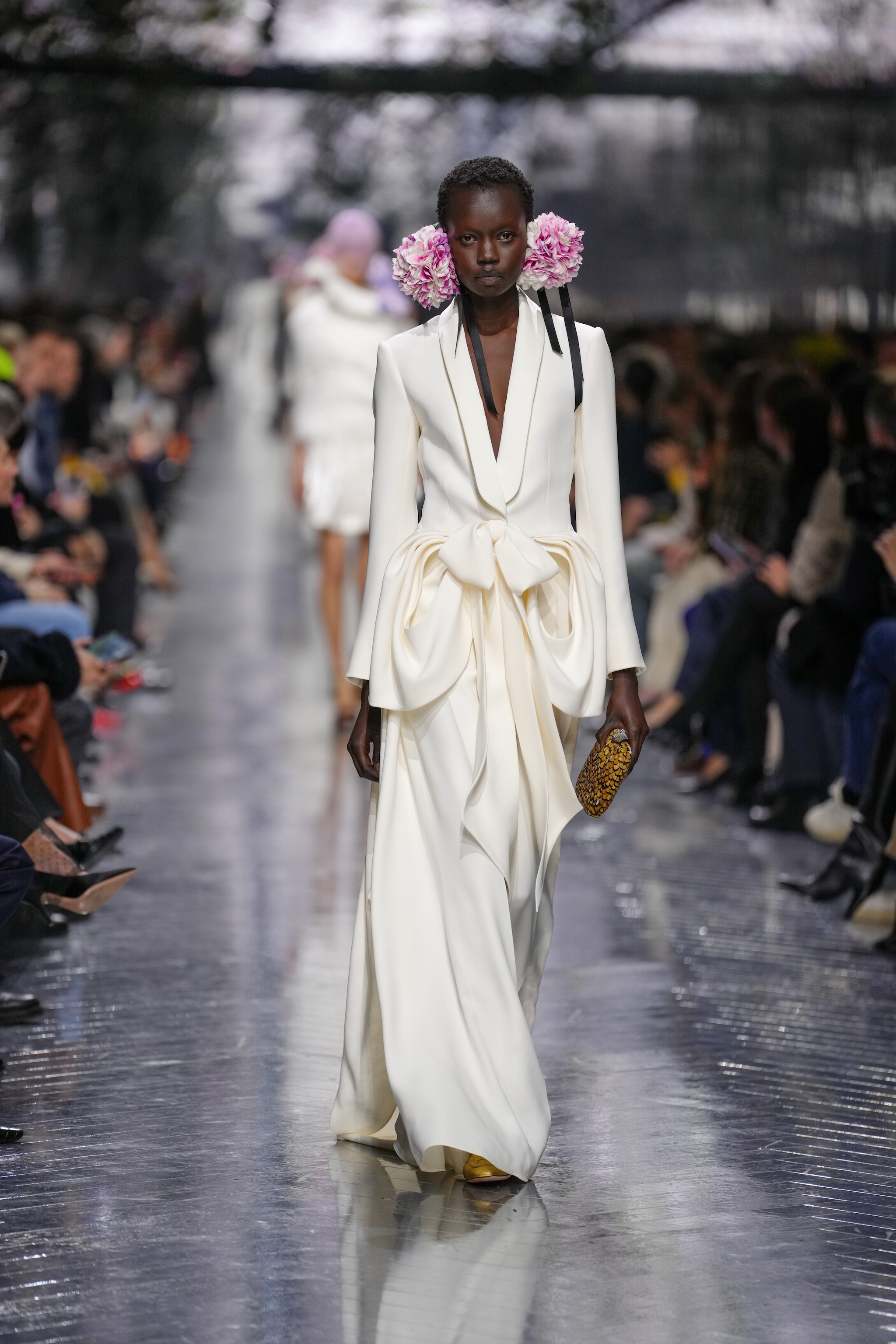 Volumi estremi, architettonici abiti dalle line tondeggianti, gonne balloon e abiti coperti di fiori tridimensionali sfilano alla Settimana dell'Alta Moda di Parigi sulla passerella Primavera/Estate 2026 di Dior nella collezione creata da Jonathan Anderson
