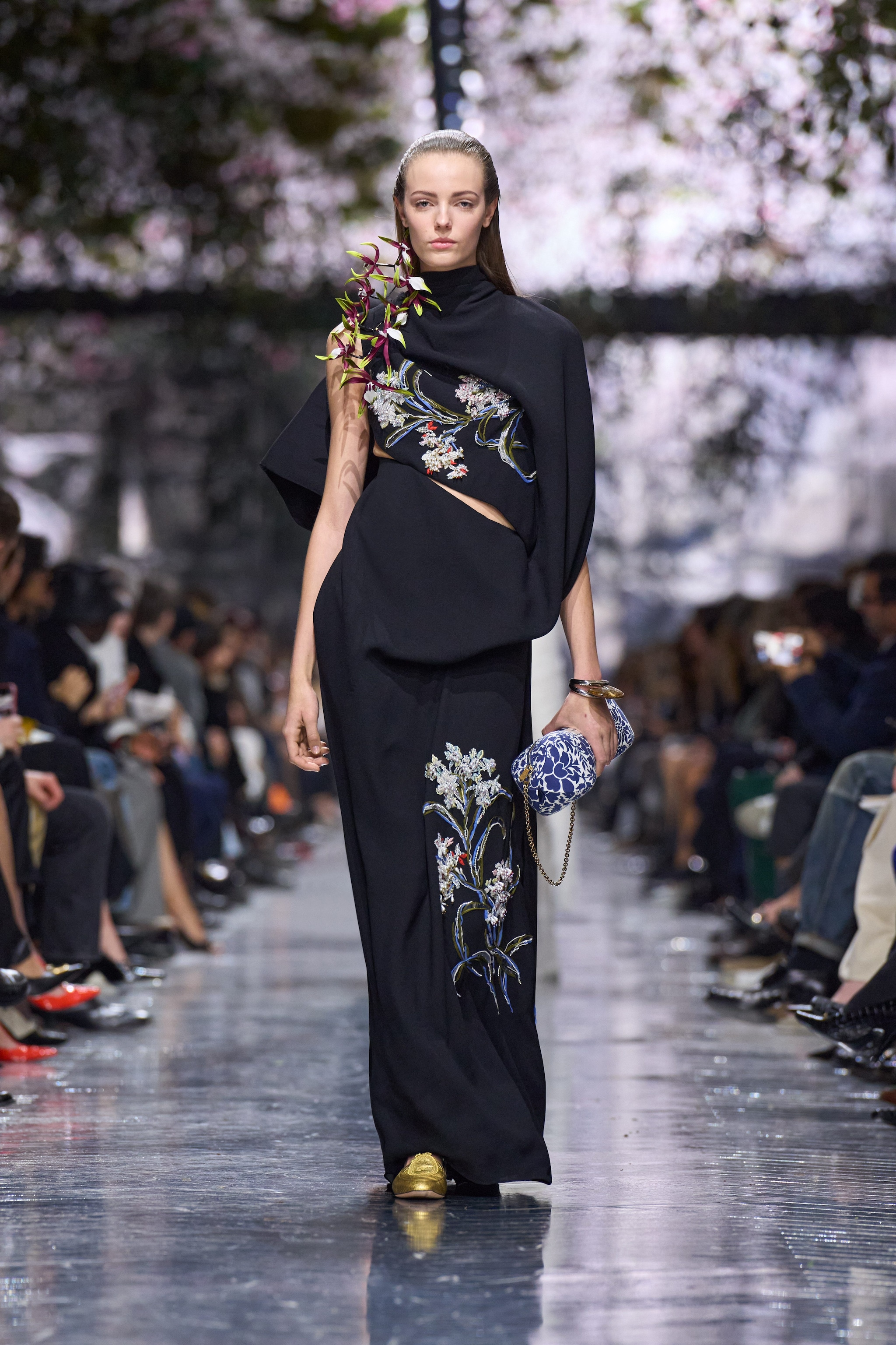 Volumi estremi, architettonici abiti dalle line tondeggianti, gonne balloon e abiti coperti di fiori tridimensionali sfilano alla Settimana dell'Alta Moda di Parigi sulla passerella Primavera/Estate 2026 di Dior nella collezione creata da Jonathan Anderson