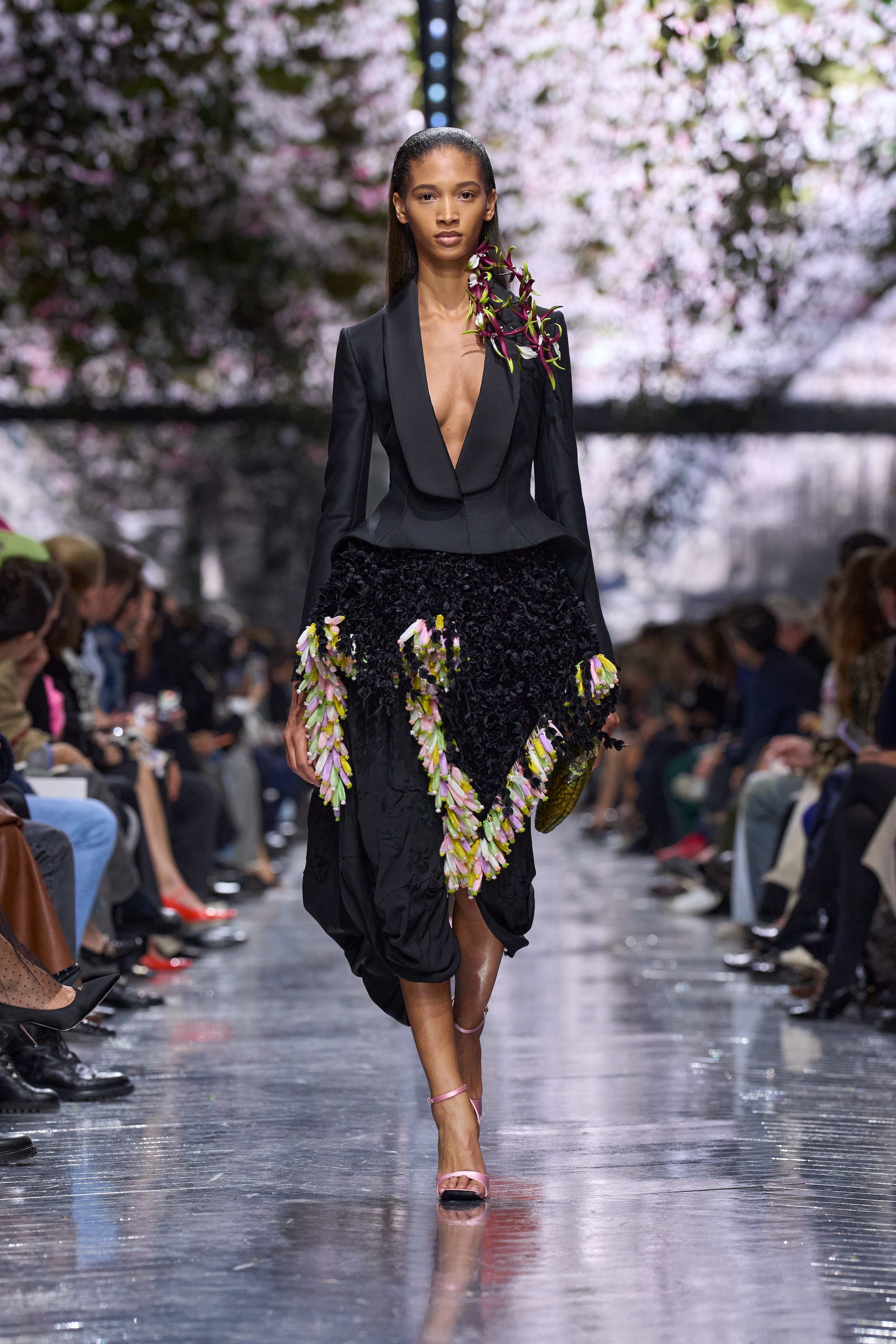 Volumi estremi, architettonici abiti dalle line tondeggianti, gonne balloon e abiti coperti di fiori tridimensionali sfilano alla Settimana dell'Alta Moda di Parigi sulla passerella Primavera/Estate 2026 di Dior nella collezione creata da Jonathan Anderson