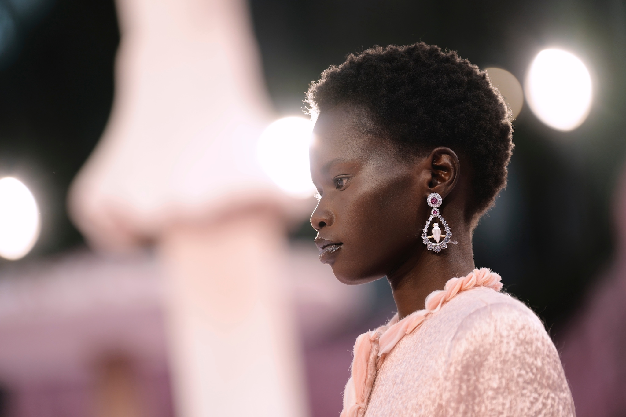 Completi in seta trasparente dai colori pastello, modelli con lunghe frange e con scultorei decori floreali, piume leggiadre e abiti in maglia materica sfilano alla Settimana dell'Alta Moda di Parigi sulla passerella Primavera/Estate 2026 di Chanel nella collezione creata da Matthieu Blazy