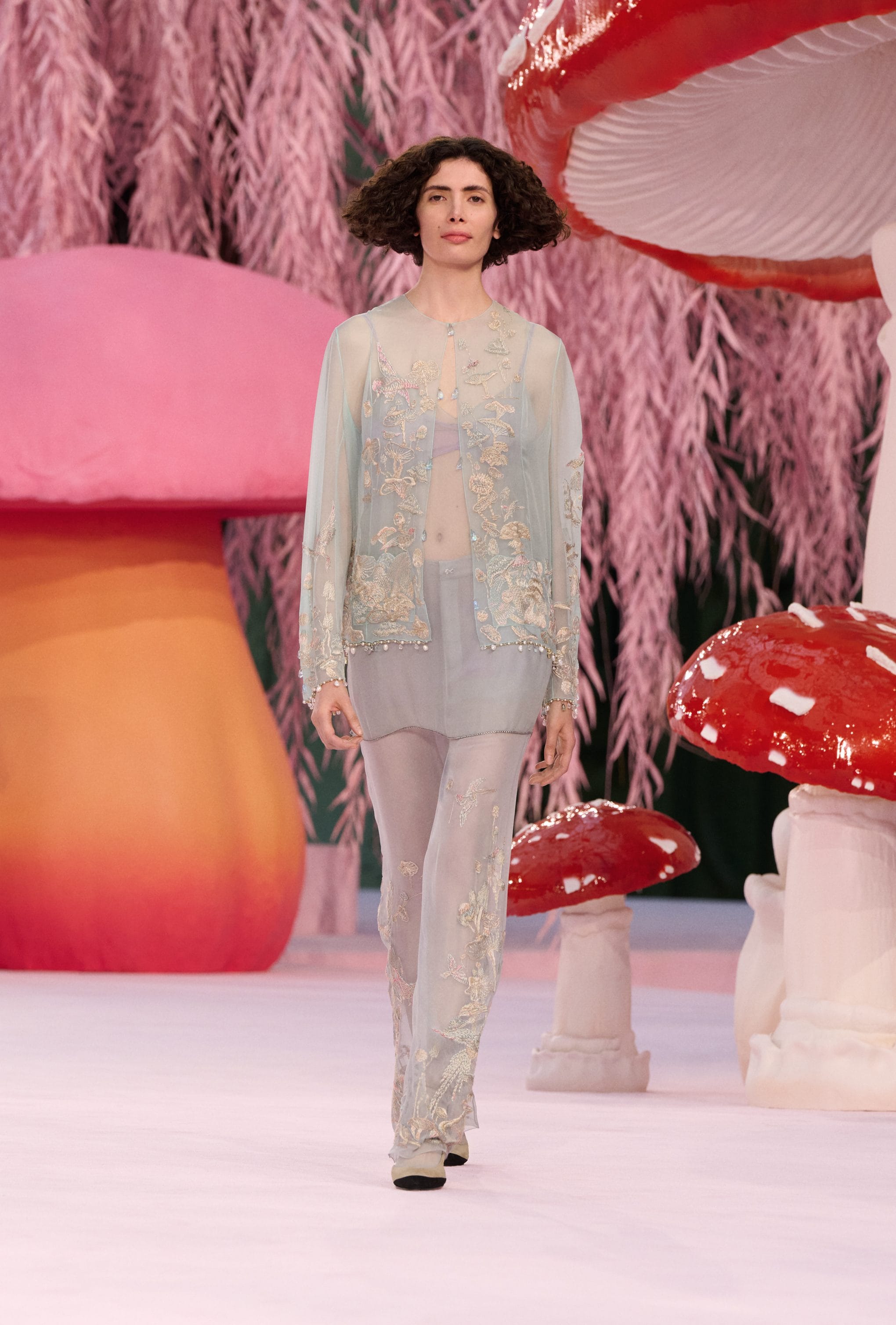 Completi in seta trasparente dai colori pastello, modelli con lunghe frange e con scultorei decori floreali, piume leggiadre e abiti in maglia materica sfilano alla Settimana dell'Alta Moda di Parigi sulla passerella Primavera/Estate 2026 di Chanel nella collezione creata da Matthieu Blazy