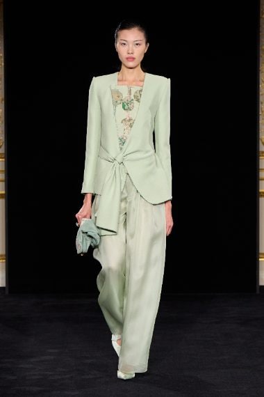 Colori pastello e tessuti cangianti, completi maschili resi più morbidi e lunghi abiti da sera con gonne che ricordano un tulipano sfilano alla Settimana dell'Alta Moda di Parigi nella collezione Primavera/Estate 2026 di Giorgio Armani Privè