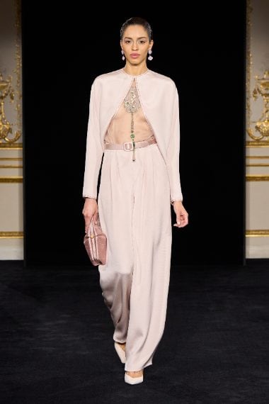 Colori pastello e tessuti cangianti, completi maschili resi più morbidi e lunghi abiti da sera con gonne che ricordano un tulipano sfilano alla Settimana dell'Alta Moda di Parigi nella collezione Primavera/Estate 2026 di Giorgio Armani Privè