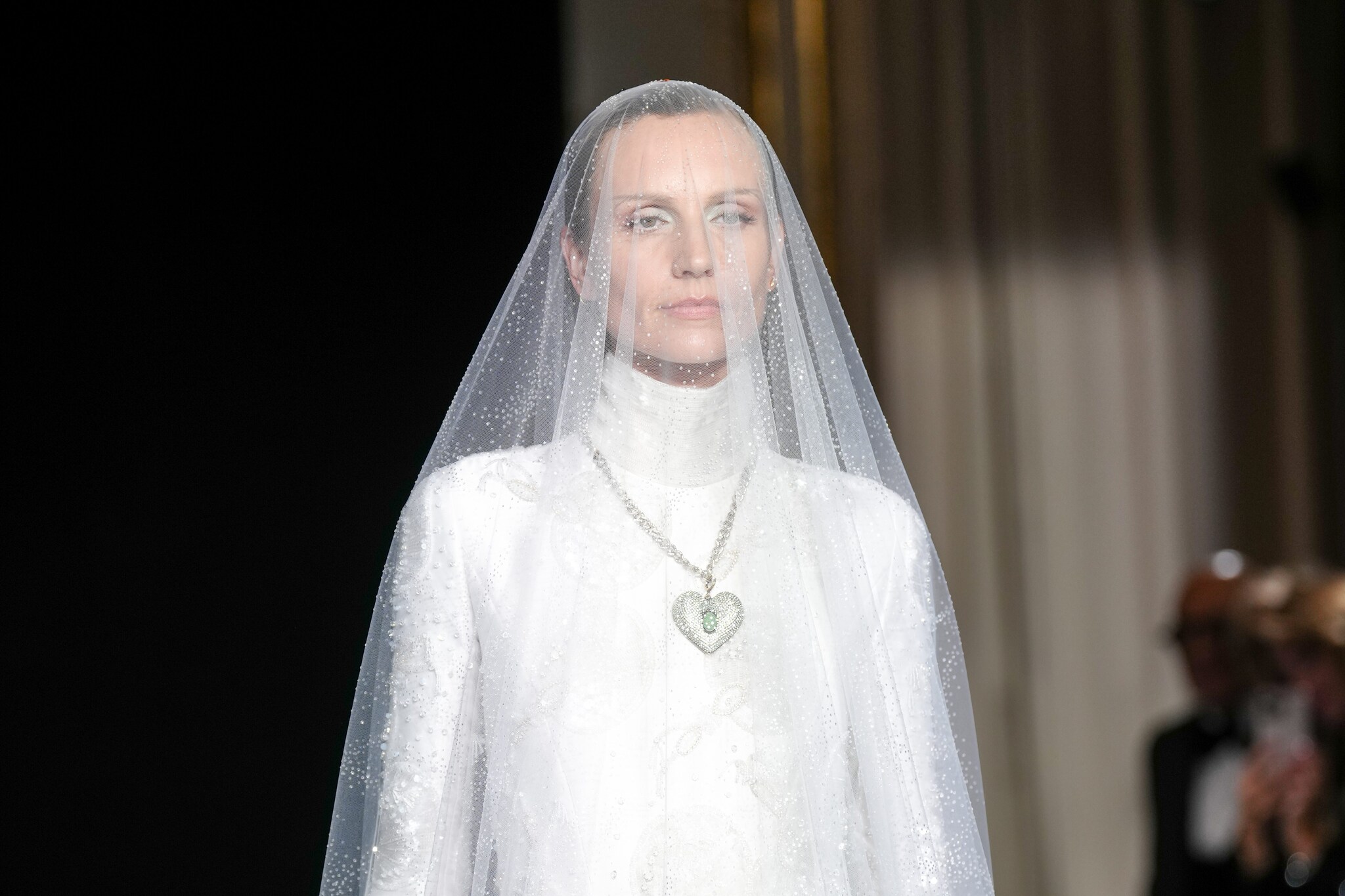 Colori pastello e tessuti cangianti, completi maschili resi più morbidi e lunghi abiti da sera con gonne che ricordano un tulipano sfilano alla Settimana dell'Alta Moda di Parigi nella collezione Primavera/Estate 2026 di Giorgio Armani Privè