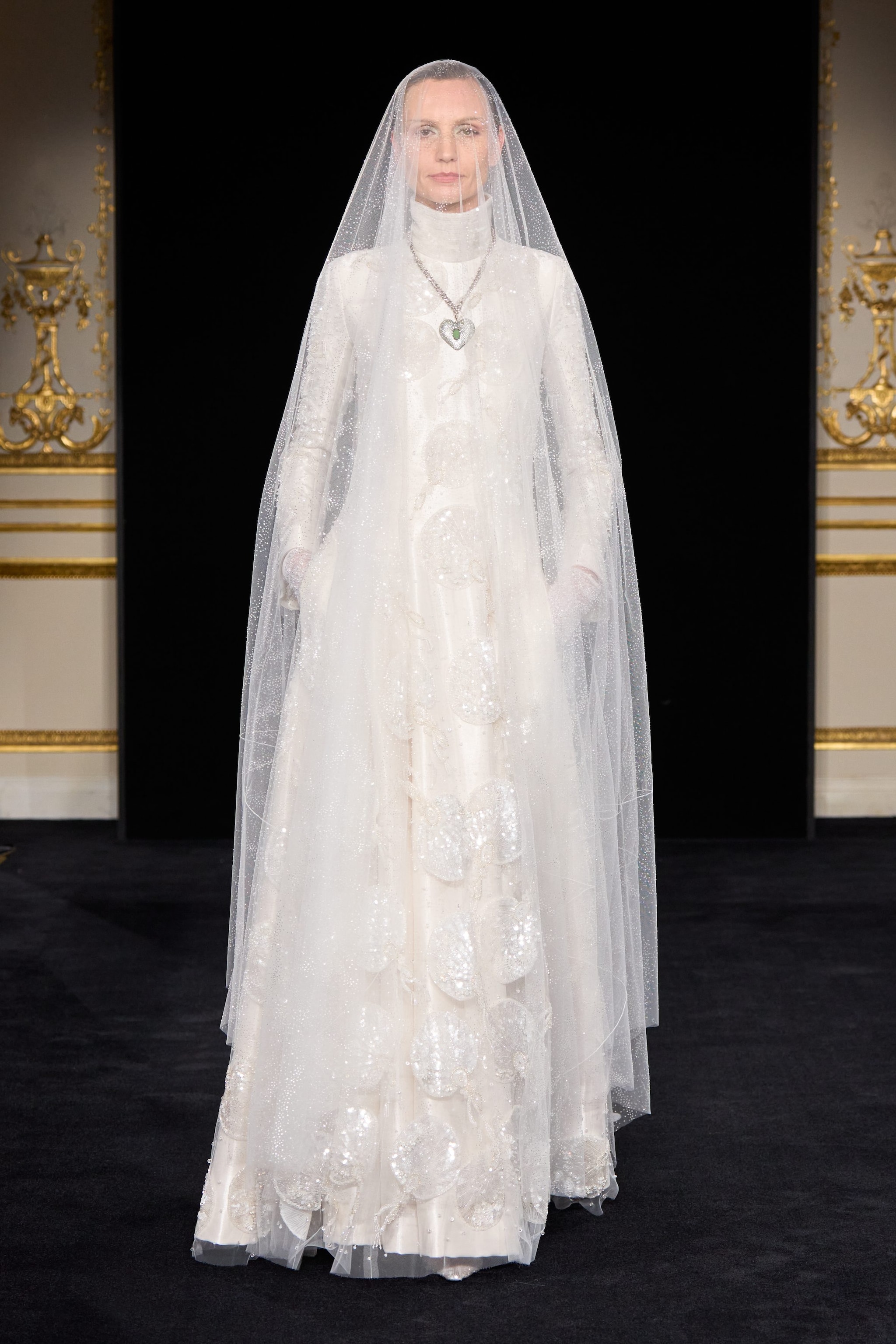 Colori pastello e tessuti cangianti, completi maschili resi più morbidi e lunghi abiti da sera con gonne che ricordano un tulipano sfilano alla Settimana dell'Alta Moda di Parigi nella collezione Primavera/Estate 2026 di Giorgio Armani Privè