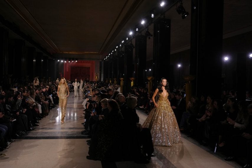Sontuosi abiti con decori gioiello, incrostazioni dorate e longdress dalle tonalità pastello sfilano alla Settimana dell'Alta Moda di Parigi sulla passerella Primavera/Estate 2026 di Elie Saab