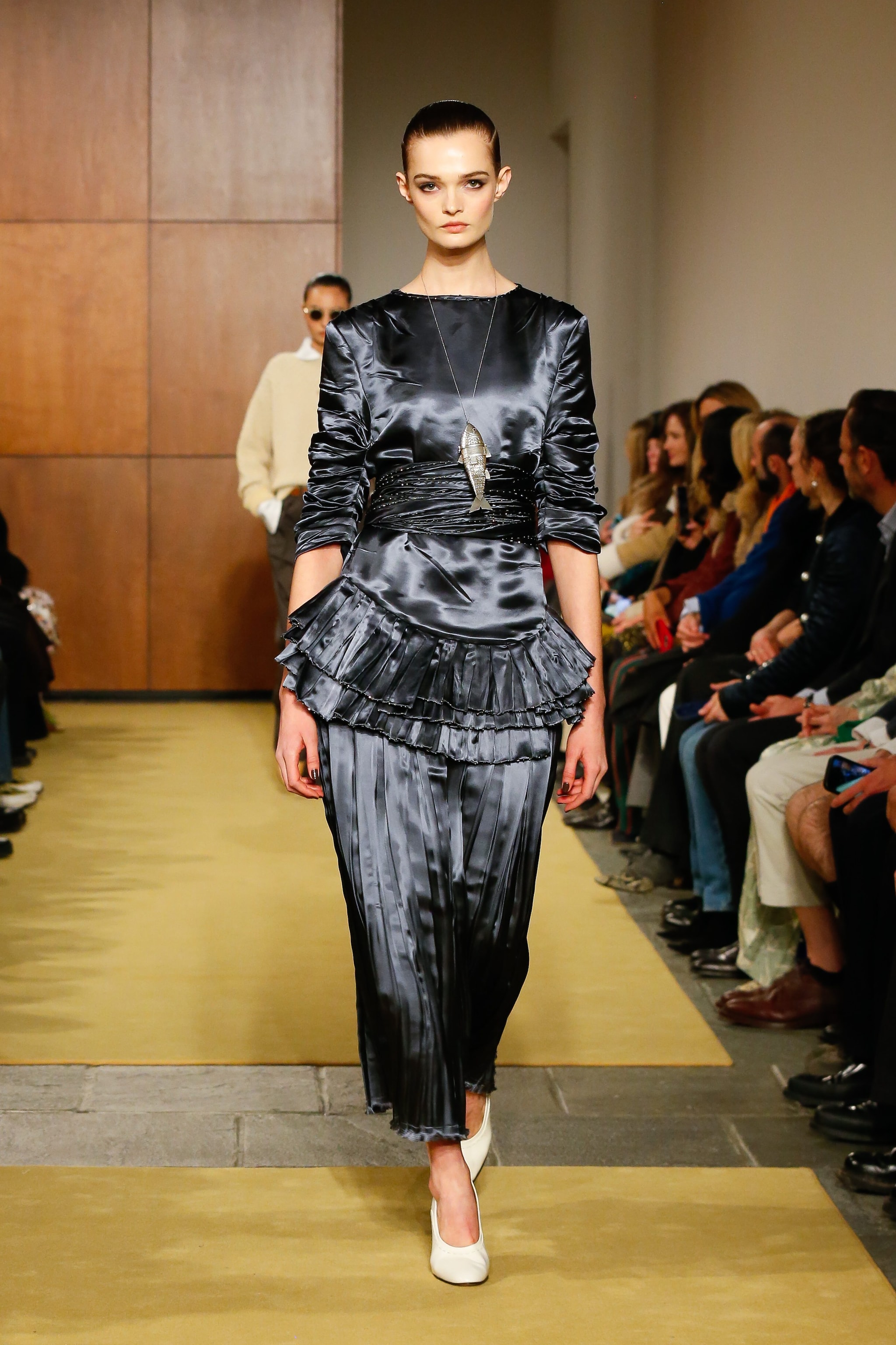 Ampi pantaloni in velluto e pencil skirt a vita bassa, cappotti militari dal collo a imbuto e trench in vernice sfilano alla New York Fashion Week sulla passerella Autunno/Inverno 2026-2027 di Tory Burch