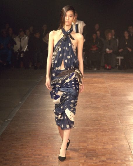 Abiti che sembrano fatti con foulard di seta, look in denim, lunghe frange e decori sparkling sfilano alla New York Fashion Week sulla passerella Autunno/Inverno 2026-2027 di Area
