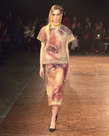 Abiti che sembrano fatti con foulard di seta, look in denim, lunghe frange e decori sparkling sfilano alla New York Fashion Week sulla passerella Autunno/Inverno 2026-2027 di Area