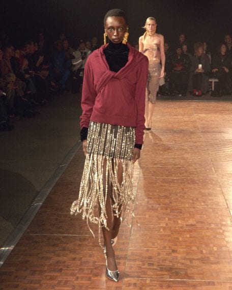 Abiti che sembrano fatti con foulard di seta, look in denim, lunghe frange e decori sparkling sfilano alla New York Fashion Week sulla passerella Autunno/Inverno 2026-2027 di Area