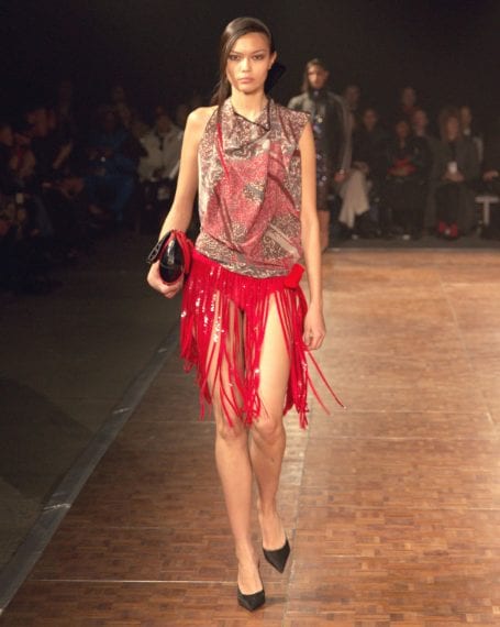 Abiti che sembrano fatti con foulard di seta, look in denim, lunghe frange e decori sparkling sfilano alla New York Fashion Week sulla passerella Autunno/Inverno 2026-2027 di Area