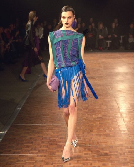 Abiti che sembrano fatti con foulard di seta, look in denim, lunghe frange e decori sparkling sfilano alla New York Fashion Week sulla passerella Autunno/Inverno 2026-2027 di Area