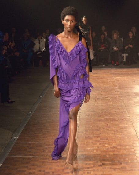 Abiti che sembrano fatti con foulard di seta, look in denim, lunghe frange e decori sparkling sfilano alla New York Fashion Week sulla passerella Autunno/Inverno 2026-2027 di Area