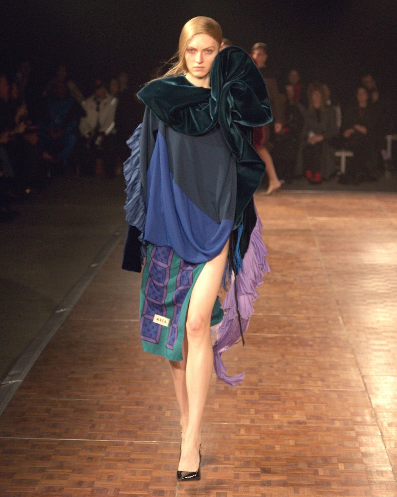 Abiti che sembrano fatti con foulard di seta, look in denim, lunghe frange e decori sparkling sfilano alla New York Fashion Week sulla passerella Autunno/Inverno 2026-2027 di Area
