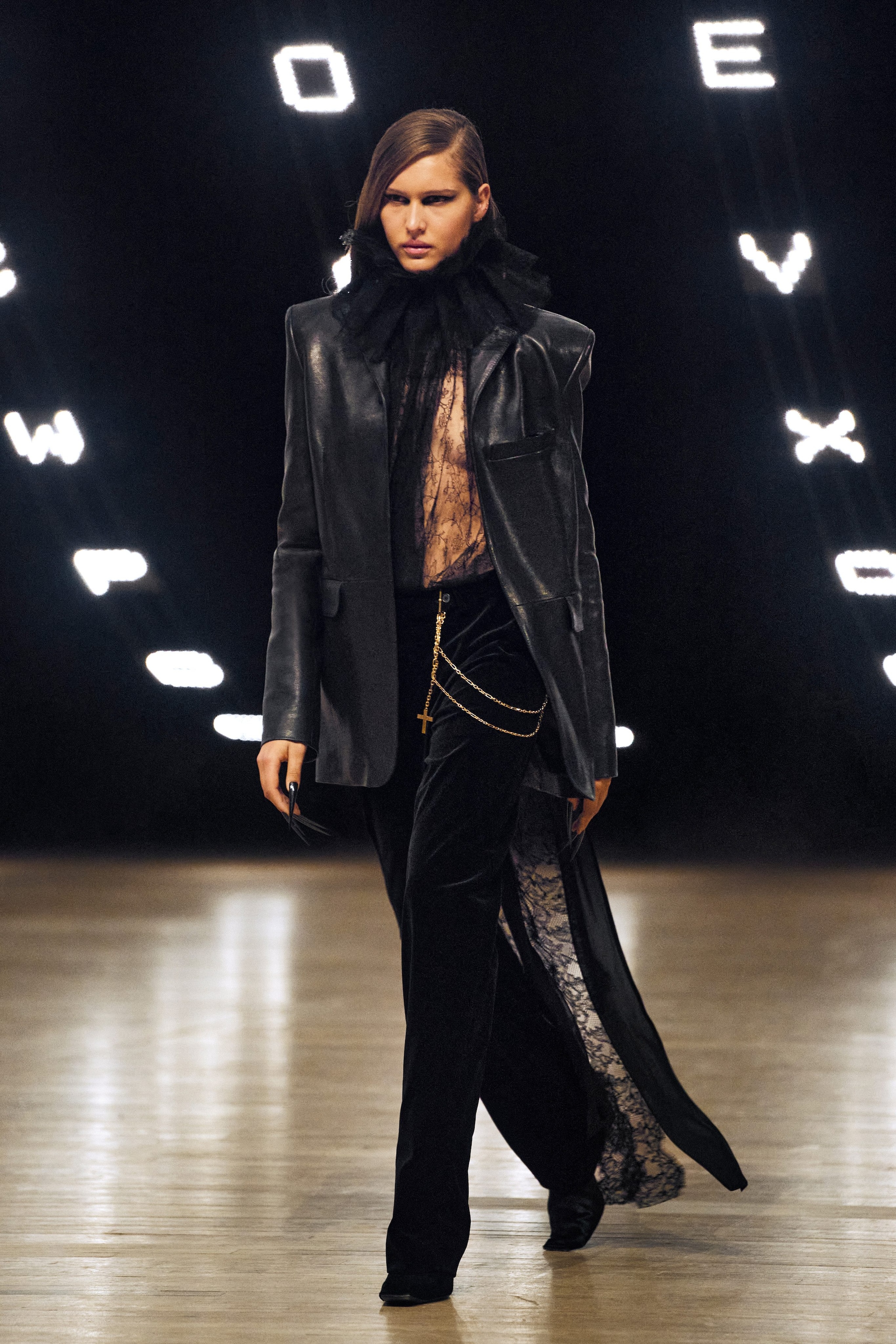 Completi in pelle e look total black, capi d'ispirazione military e ricami floreali sul velluto scuro sfilano alla New York Fashion Week sulla passerella Autunno/Inverno 2026-2027 di Khaite
