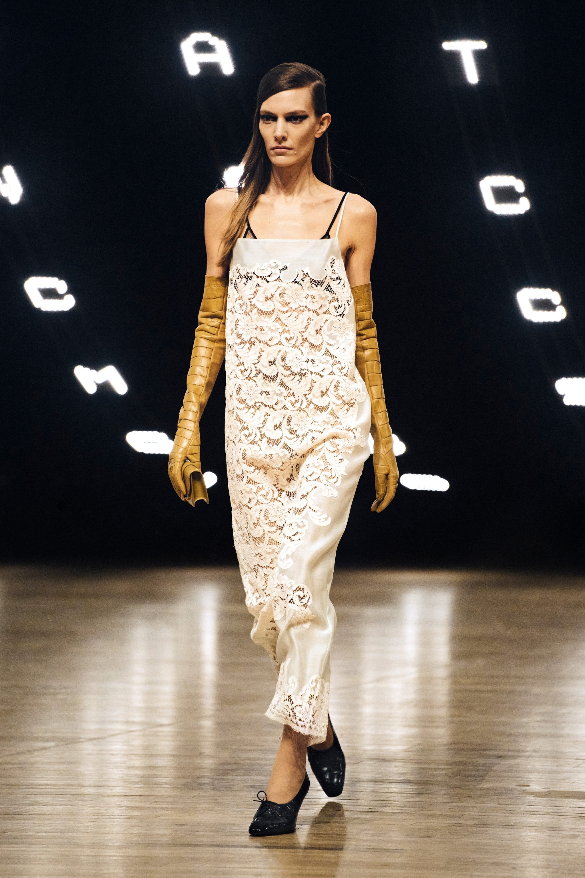 Completi in pelle e look total black, capi d'ispirazione military e ricami floreali sul velluto scuro sfilano alla New York Fashion Week sulla passerella Autunno/Inverno 2026-2027 di Khaite