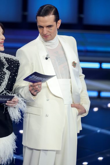 6. Achille Lauro conduce Sanremo 2026, nella seconda serata abito bianco e collana di diamanti e rubini