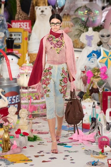 Lana drappeggiata e denim stropicciato, inserti in tartan e decori floreali sfilano alla Milano Fashion Week sulla passerella Autunno/Inverno 2026-2027 di Diesel.