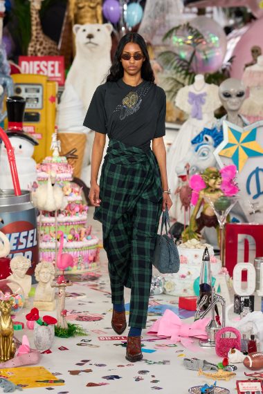 Lana drappeggiata e denim stropicciato, inserti in tartan e decori floreali sfilano alla Milano Fashion Week sulla passerella Autunno/Inverno 2026-2027 di Diesel.
