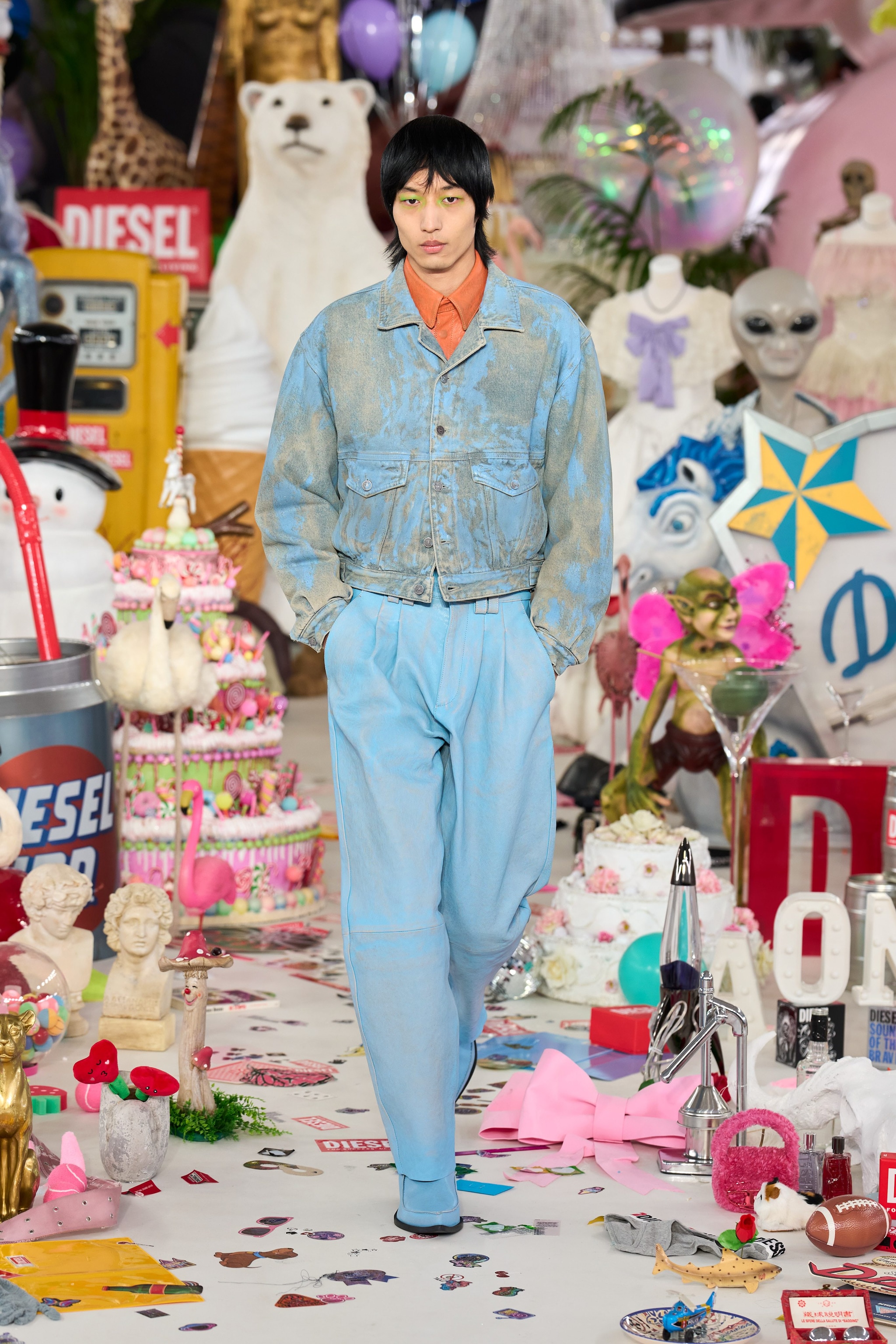 Lana drappeggiata e denim stropicciato, inserti in tartan e decori floreali sfilano alla Milano Fashion Week sulla passerella Autunno/Inverno 2026-2027 di Diesel.