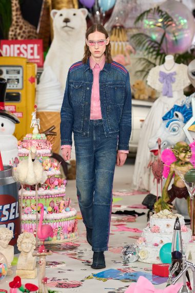 Lana drappeggiata e denim stropicciato, inserti in tartan e decori floreali sfilano alla Milano Fashion Week sulla passerella Autunno/Inverno 2026-2027 di Diesel.