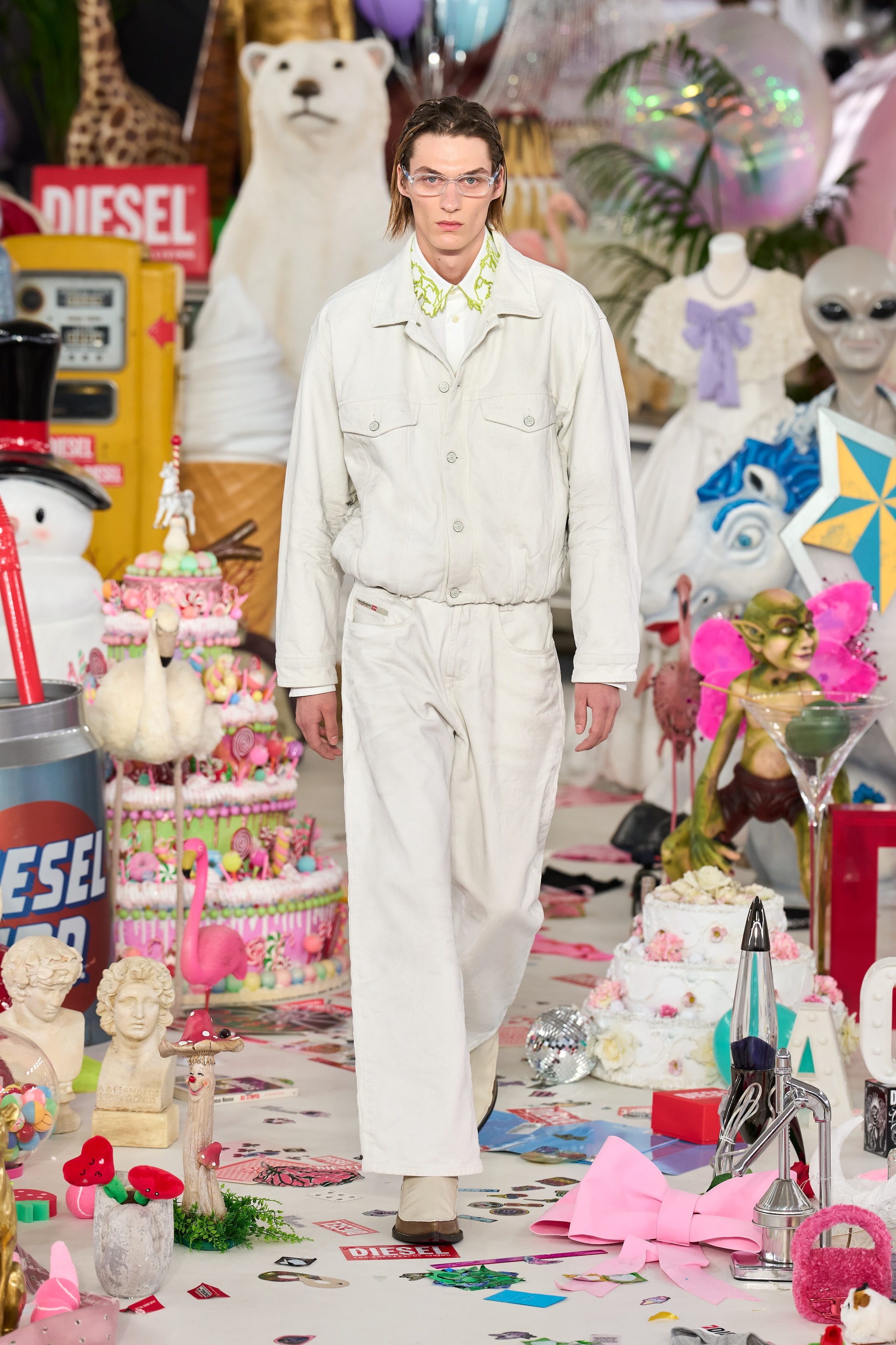 Lana drappeggiata e denim stropicciato, inserti in tartan e decori floreali sfilano alla Milano Fashion Week sulla passerella Autunno/Inverno 2026-2027 di Diesel.