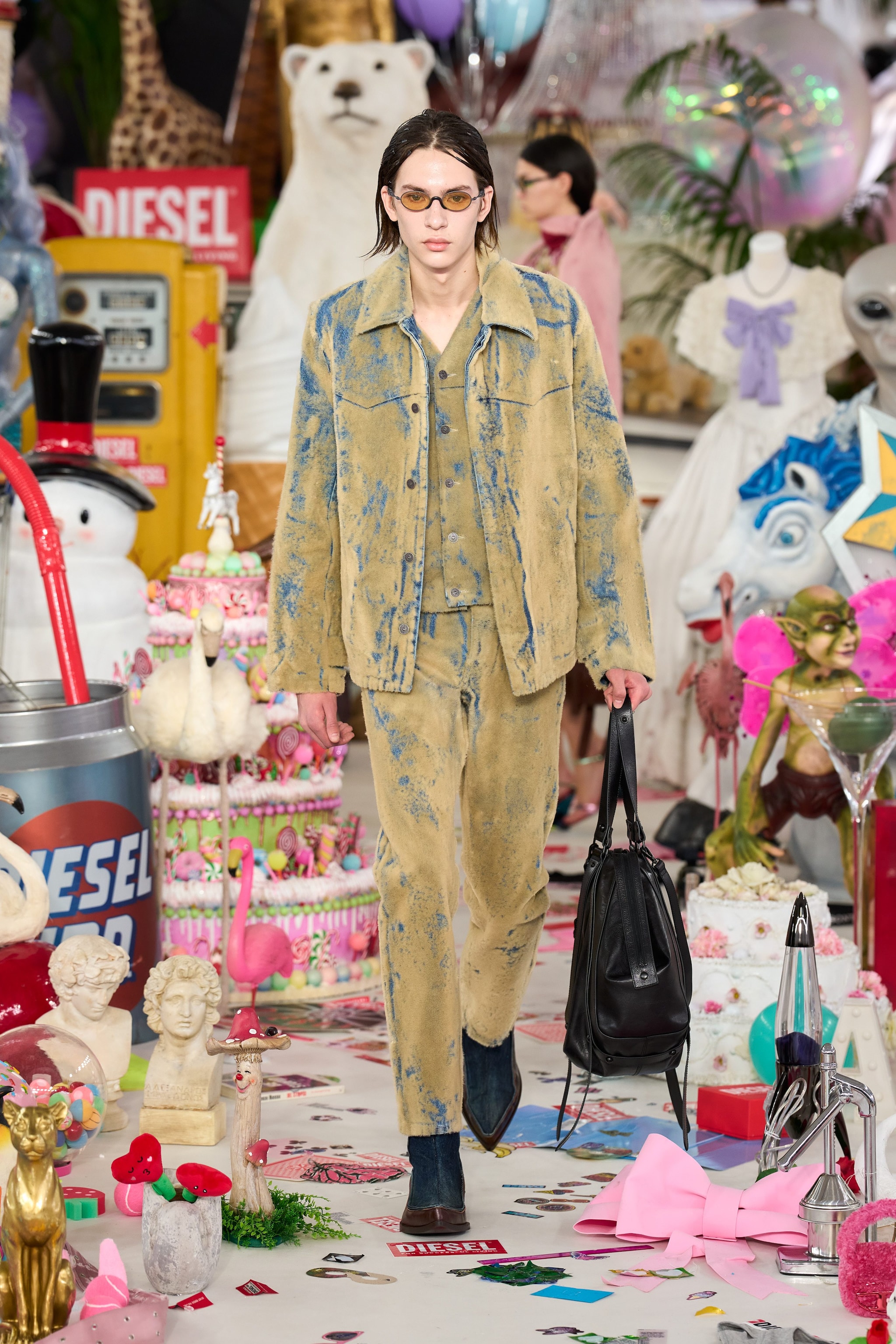 Lana drappeggiata e denim stropicciato, inserti in tartan e decori floreali sfilano alla Milano Fashion Week sulla passerella Autunno/Inverno 2026-2027 di Diesel.