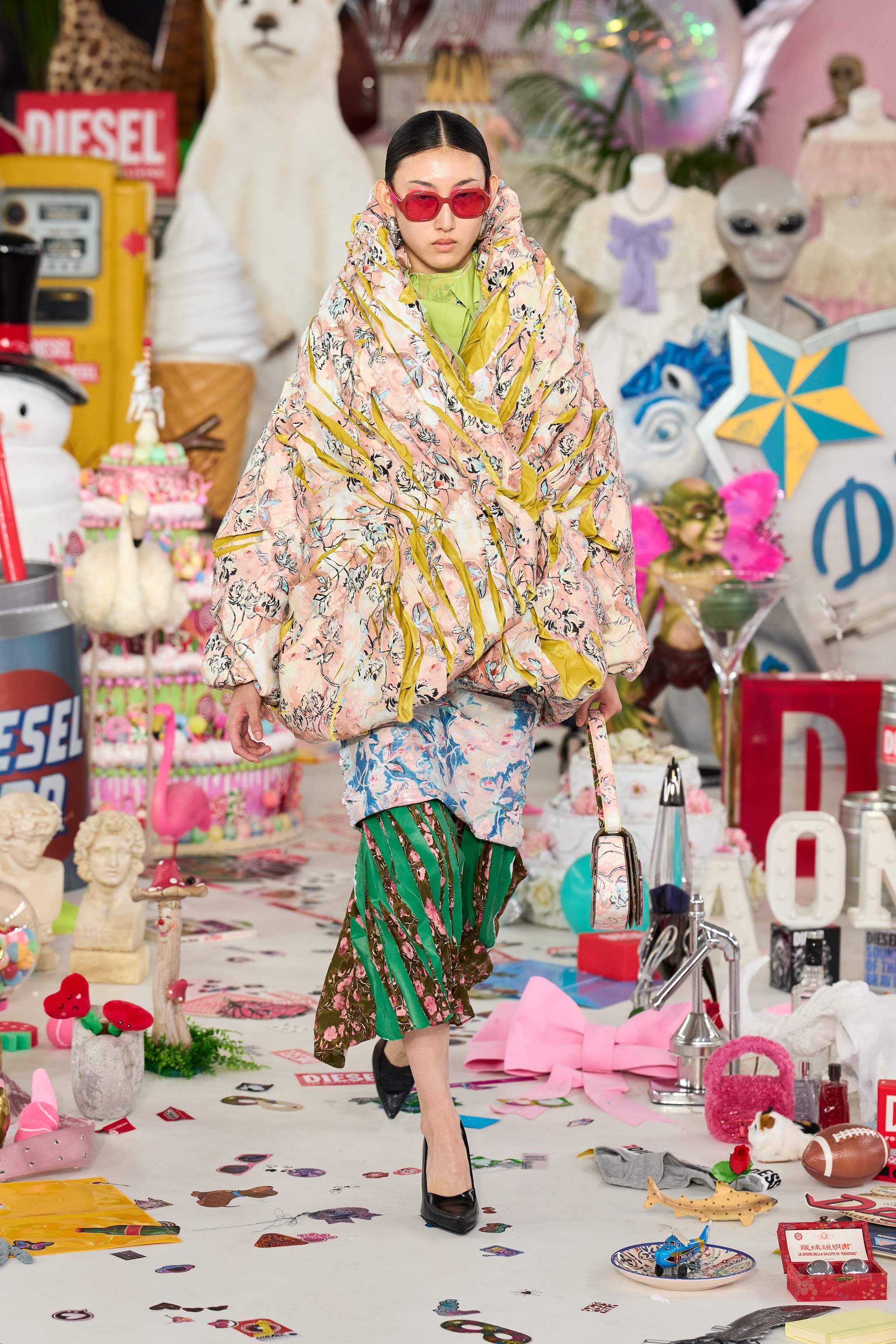 Lana drappeggiata e denim stropicciato, inserti in tartan e decori floreali sfilano alla Milano Fashion Week sulla passerella Autunno/Inverno 2026-2027 di Diesel.