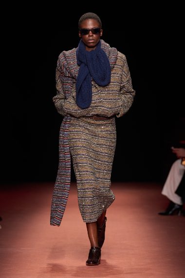 Cappotti e blazer oversize, completi in lana e ancora fantasie spigate o a righe sfilano alla Milano Fashion Week sulla passerella Autunno/Inverno 2026-2027 di Missoni.