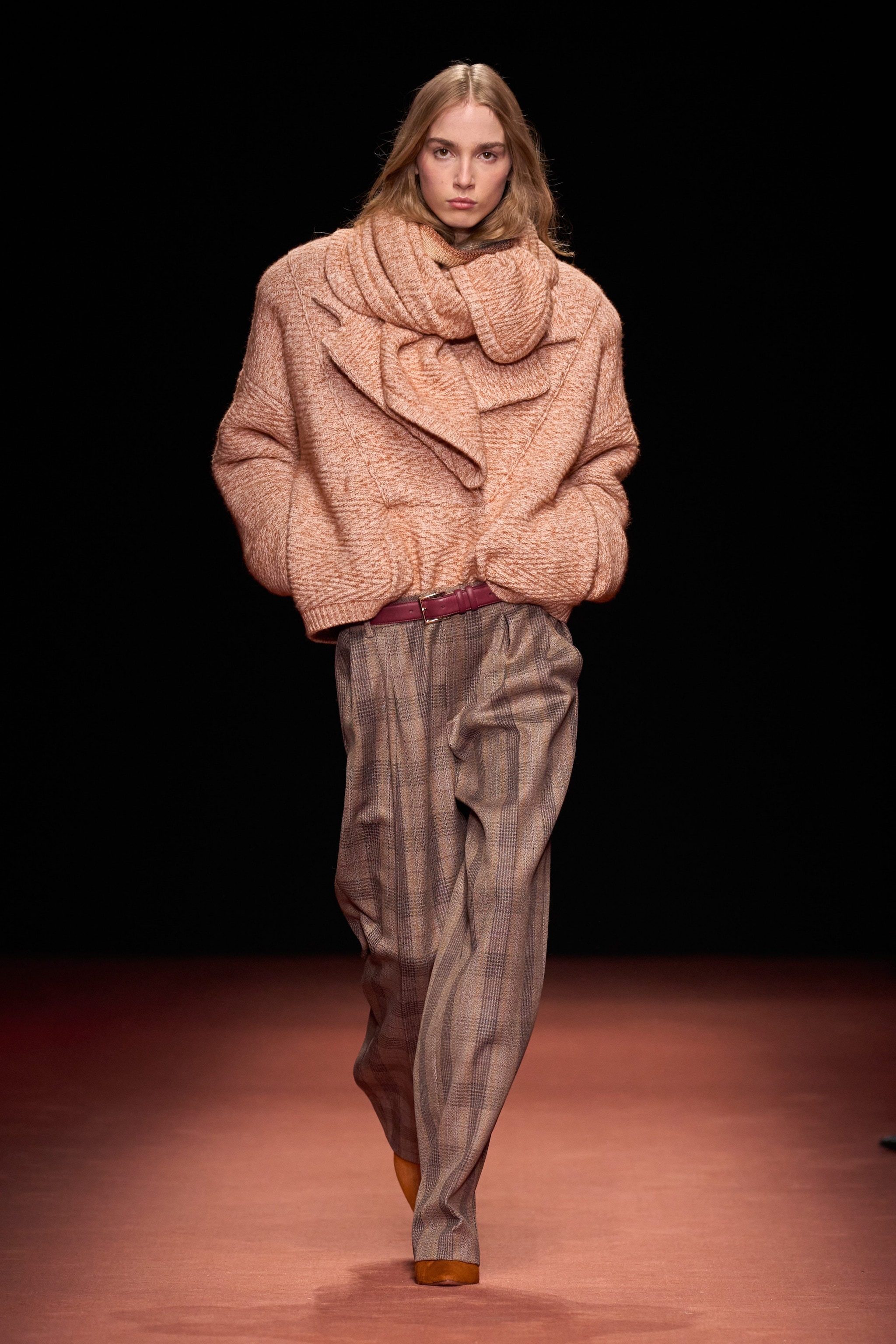 Cappotti e blazer oversize, completi in lana e ancora fantasie spigate o a righe sfilano alla Milano Fashion Week sulla passerella Autunno/Inverno 2026-2027 di Missoni.
