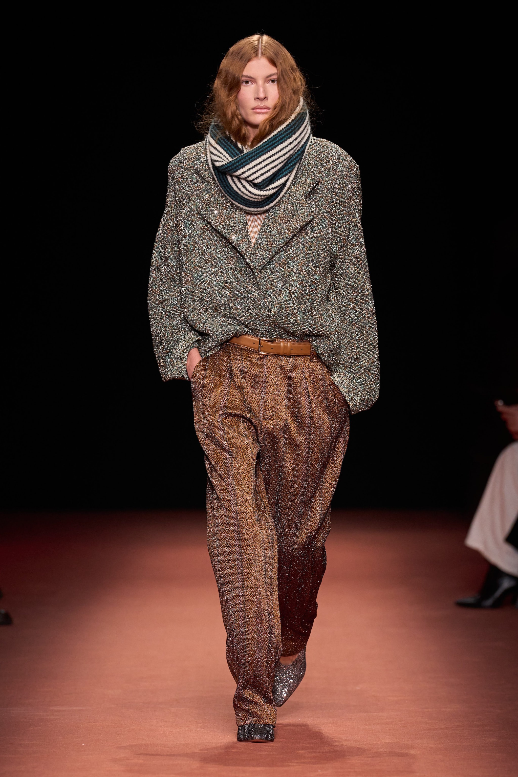 Cappotti e blazer oversize, completi in lana e ancora fantasie spigate o a righe sfilano alla Milano Fashion Week sulla passerella Autunno/Inverno 2026-2027 di Missoni.
