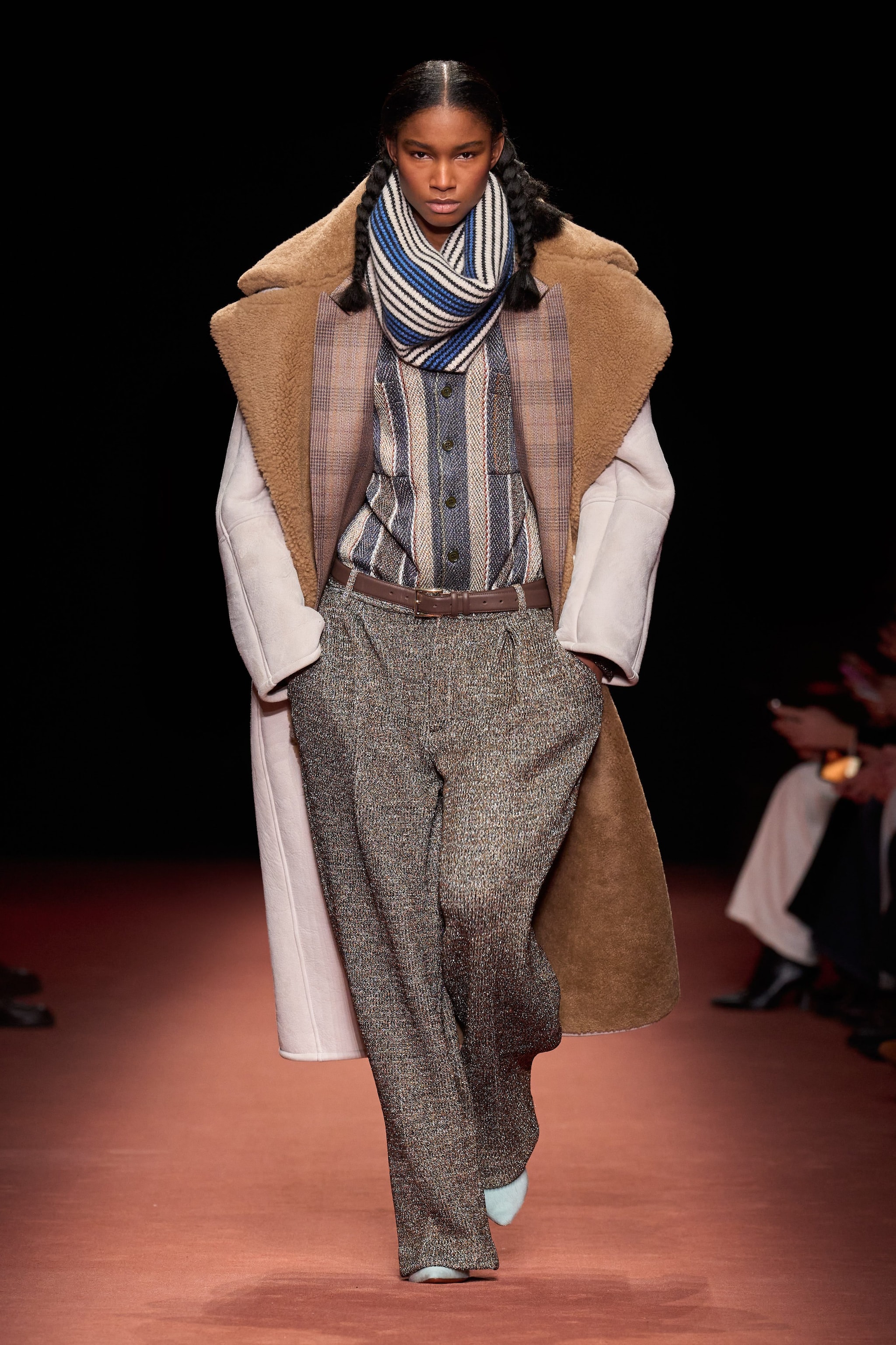 Cappotti e blazer oversize, completi in lana e ancora fantasie spigate o a righe sfilano alla Milano Fashion Week sulla passerella Autunno/Inverno 2026-2027 di Missoni.