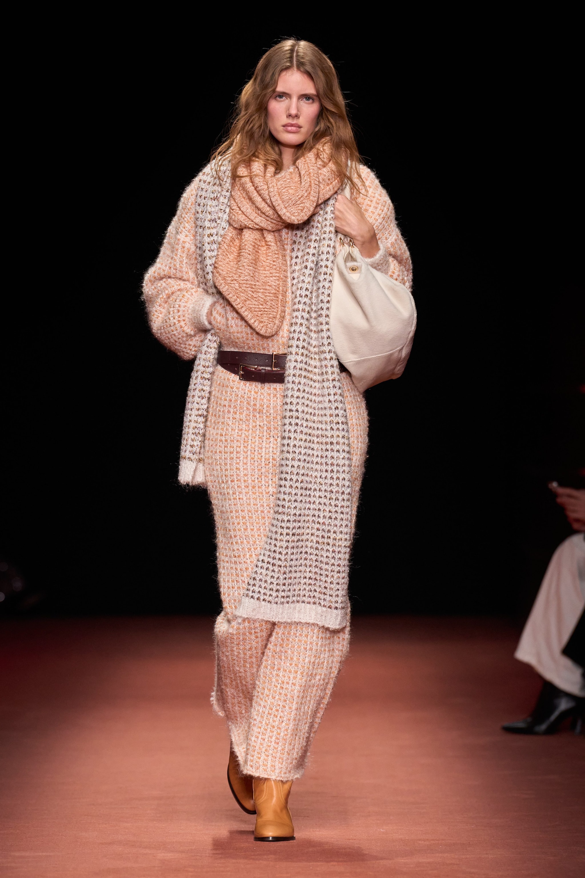 Cappotti e blazer oversize, completi in lana e ancora fantasie spigate o a righe sfilano alla Milano Fashion Week sulla passerella Autunno/Inverno 2026-2027 di Missoni.