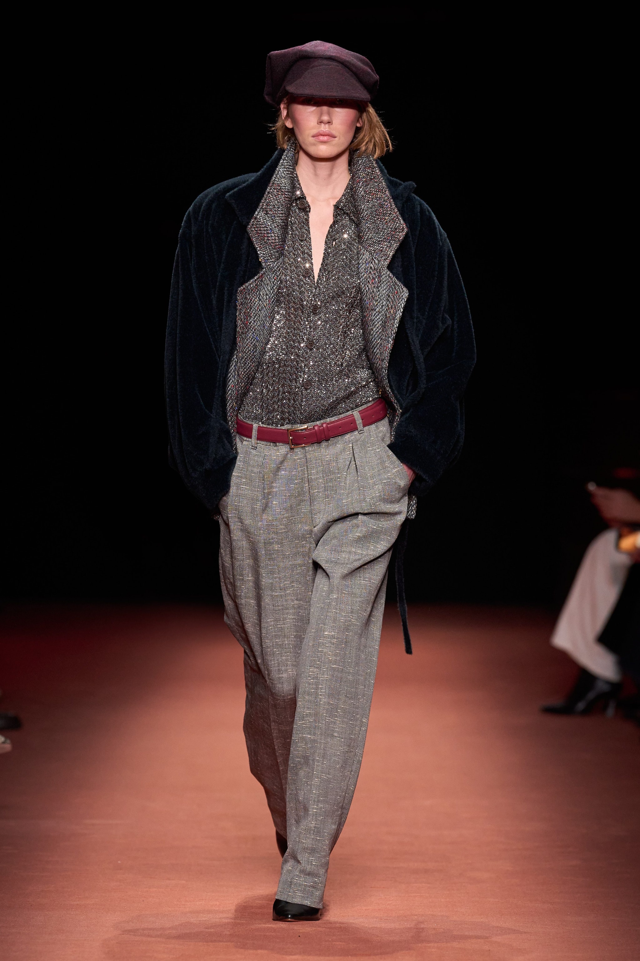 Cappotti e blazer oversize, completi in lana e ancora fantasie spigate o a righe sfilano alla Milano Fashion Week sulla passerella Autunno/Inverno 2026-2027 di Missoni.