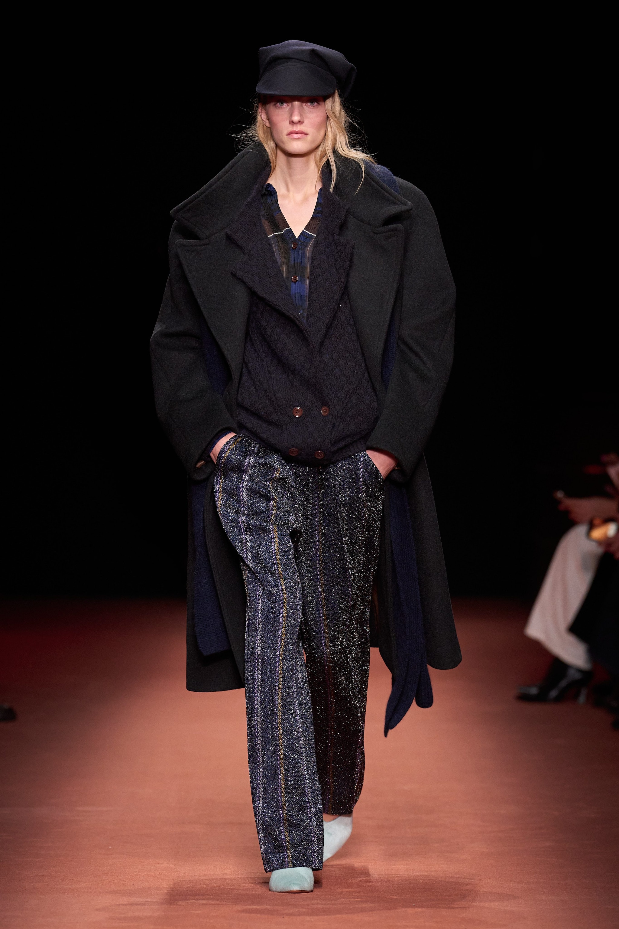 Cappotti e blazer oversize, completi in lana e ancora fantasie spigate o a righe sfilano alla Milano Fashion Week sulla passerella Autunno/Inverno 2026-2027 di Missoni.