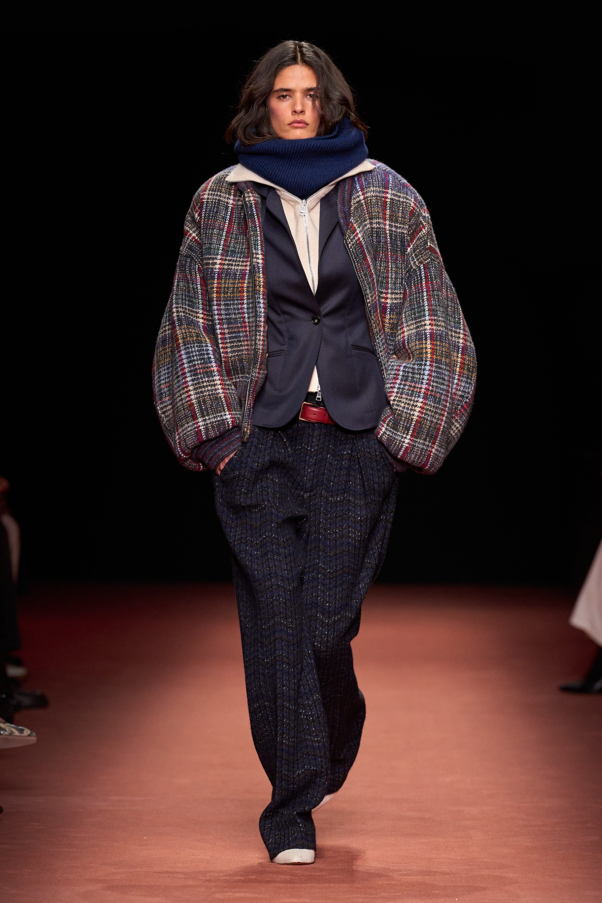 Cappotti e blazer oversize, completi in lana e ancora fantasie spigate o a righe sfilano alla Milano Fashion Week sulla passerella Autunno/Inverno 2026-2027 di Missoni.